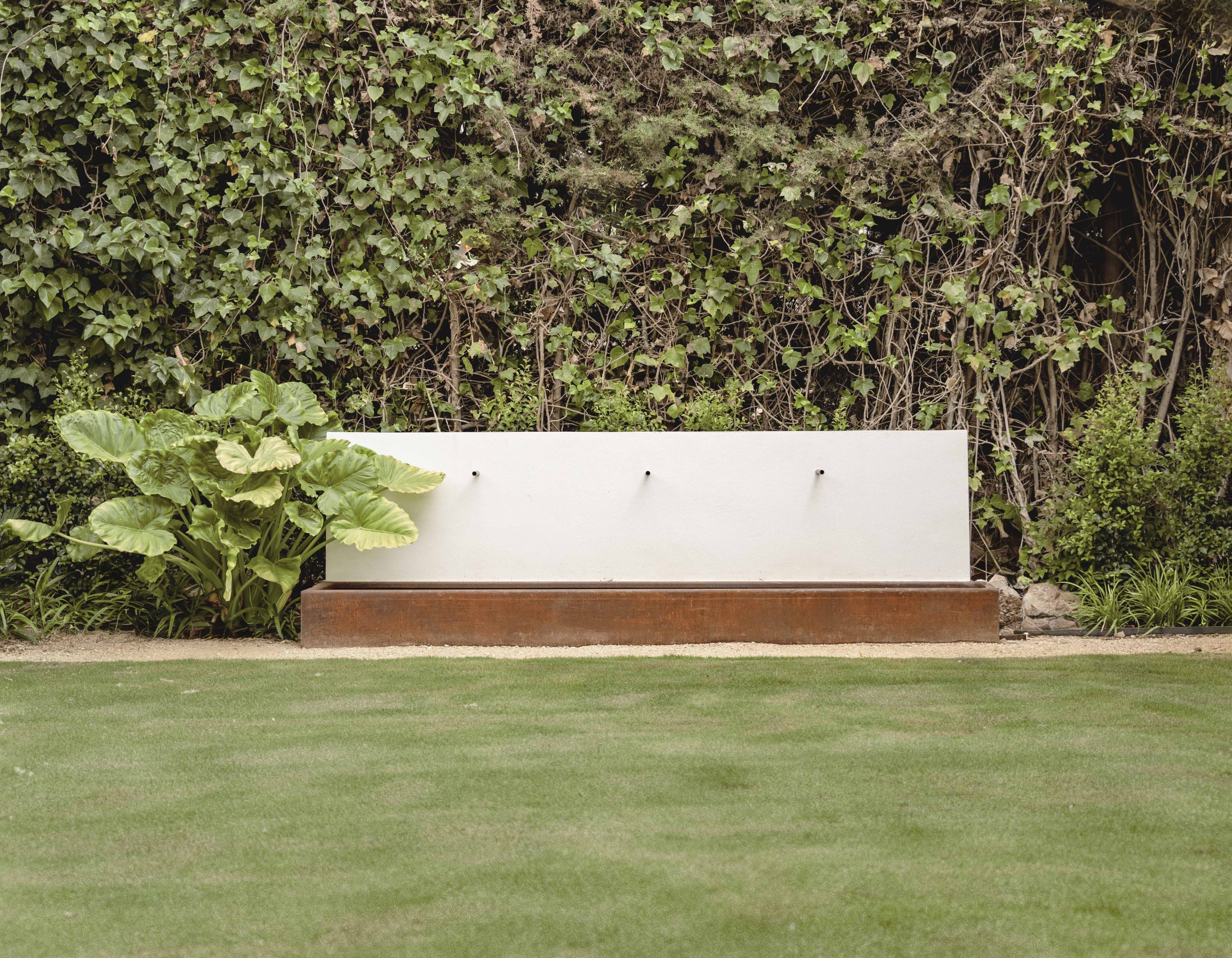 Corten steel is used to retain soil, outline paths and frame planting beds. Its rich, oxidised surface naturally blends with the tones of the foliage and earth. The same material forms the structure of the fountain, lending this central feature both weight and texture. Its presence in different parts of the garden helps unify the design both visually and materially, creating a theme that connects the landscape across its different levels. Natural wood features in carpentry and detailing, providing a tactile, honest quality that softens transitions between built and planted areas. Walls and paved surfaces in neutral tones contribute to the overall clarity of the space. Their subtle colours reduce visual noise and sustain a calm, measured atmosphere that changes gently with the light throughout the day.